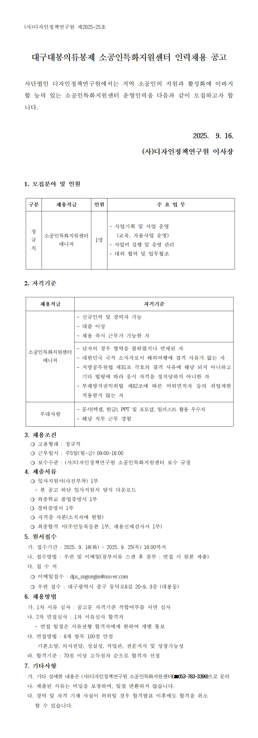대구대봉의류봉제 소공인특화지원센터 전문 인력채용 공고 (9/16~9/25)